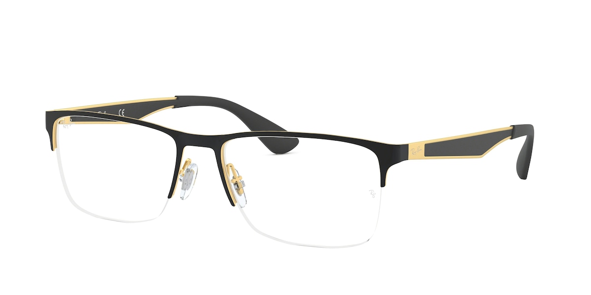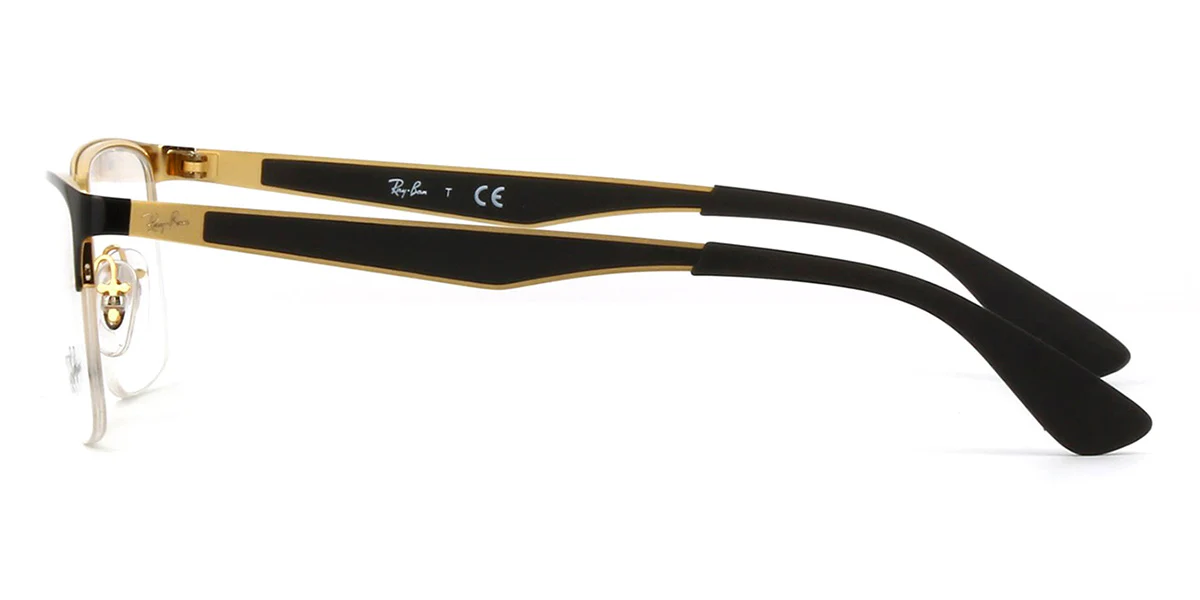 Ray‑Ban RX6335 / Ray‑Ban Eyeglasses RB 6335 2890 Black On Gold Half Rim (6335 2890 54‑17 145) is a unisex semi‑rim metal eyeglass frame with a classic rectangular shape. The 2890 color is a stylish black on gold finish, combining polished black accents with subtle gold detailing on the frame for a refined look. The 54 mm lens width, 17 mm bridge, and 145 mm temple length make it comfortable and well‑balanced for everyday wear. Its lightweight metal build and half‑rim design give it a sleek, understated appeal that pairs well with both casual and professional outfits