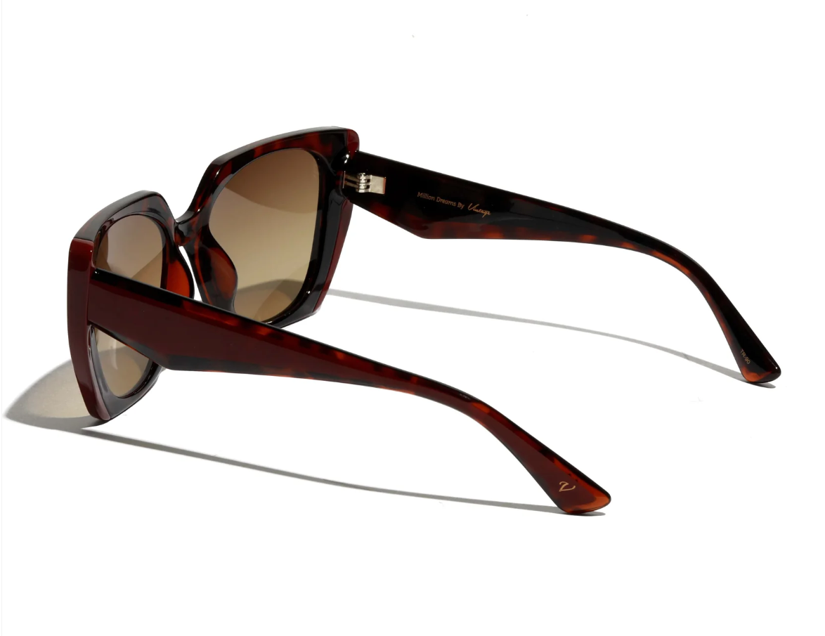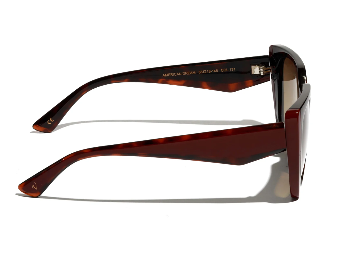 Vintage American Dream (55-18 145 COL.131) features a bold oversized square shape that creates a strong vintage fashion statement. The frame comes in a rich brown Havana tortoiseshell pattern with warm amber highlights for a classic look. The lenses are finished with a brown gradient tint, offering smooth visual comfort and elegant sun protection. Its well-defined structure provides a confident and flattering fit. A perfect blend of retro charm and modern sophistication.