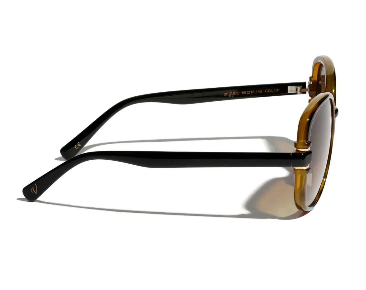 Vintage Seduce (55-18 143 COL.131) is a stylish pair of sunglasses featuring a warm brown tortoiseshell frame that blends rich earthy tones for a classic yet modern look. The brown gradient-tinted lenses add depth and a soft, flattering tint that reduces glare while enhancing contrast. With a 55-18 lens/bridge and 143 mm temples, it offers a comfortable, slightly bold fit that suits many face shapes. These sunglasses blend timeless style with everyday wearability, perfect for both casual outings and more polished looks.